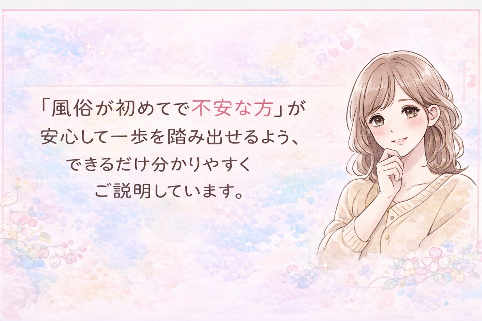 当店はM性感専門店として、 完全ソフトサービスのみで運営しています。 風俗が初めての方でも安心して始められる環境を整えています。