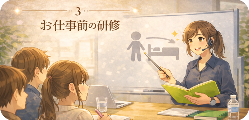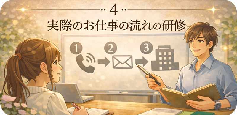 実際のお仕事の流れに沿って実践での研修を行います。もちろん女性講師が担当です。